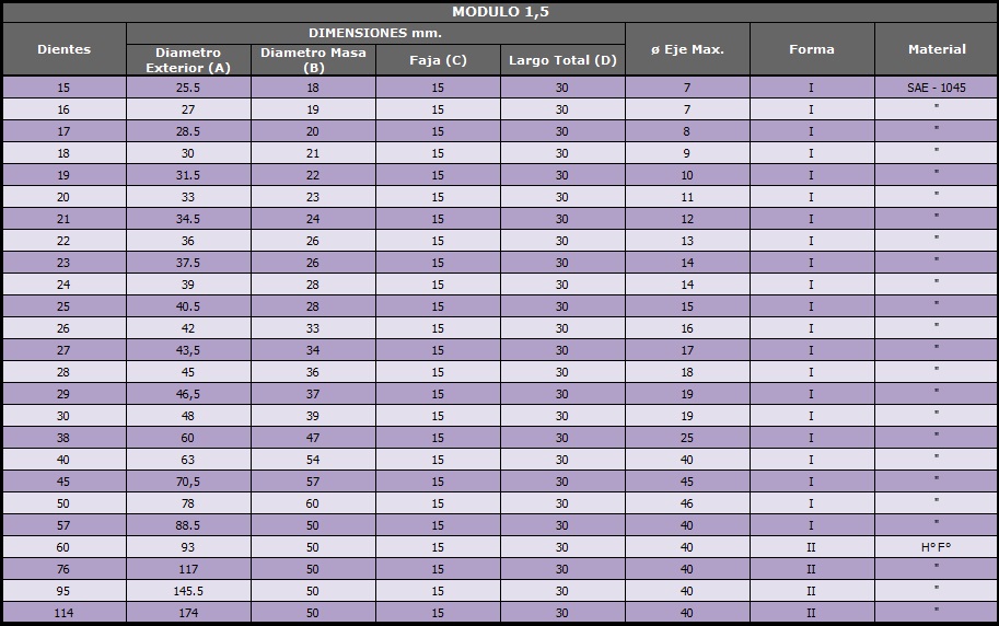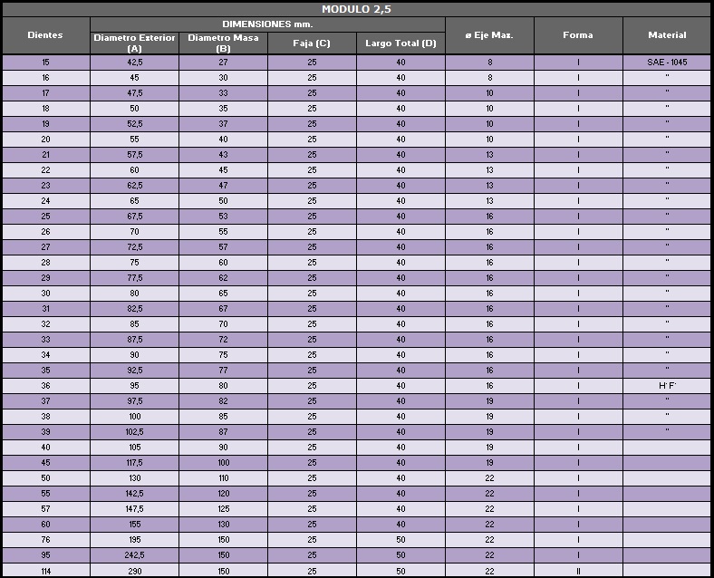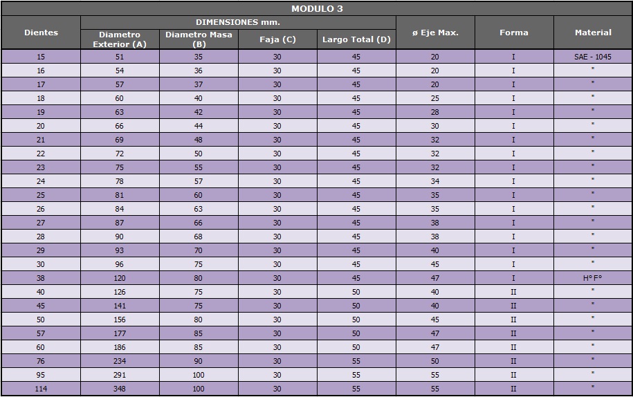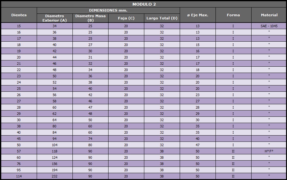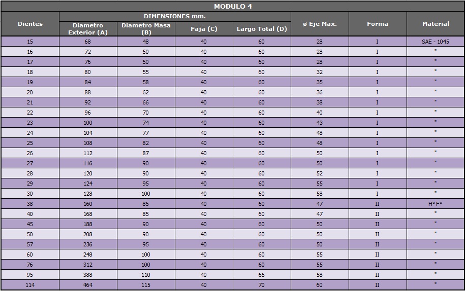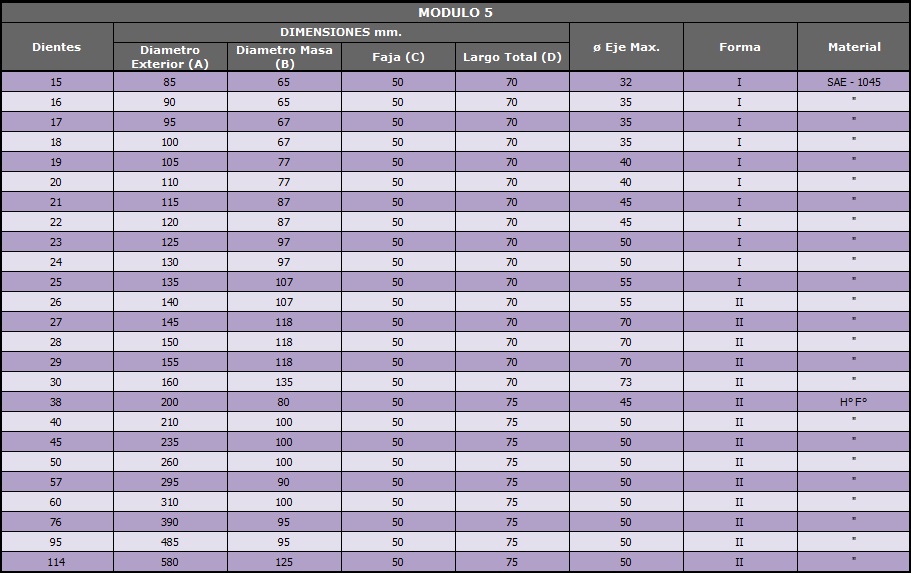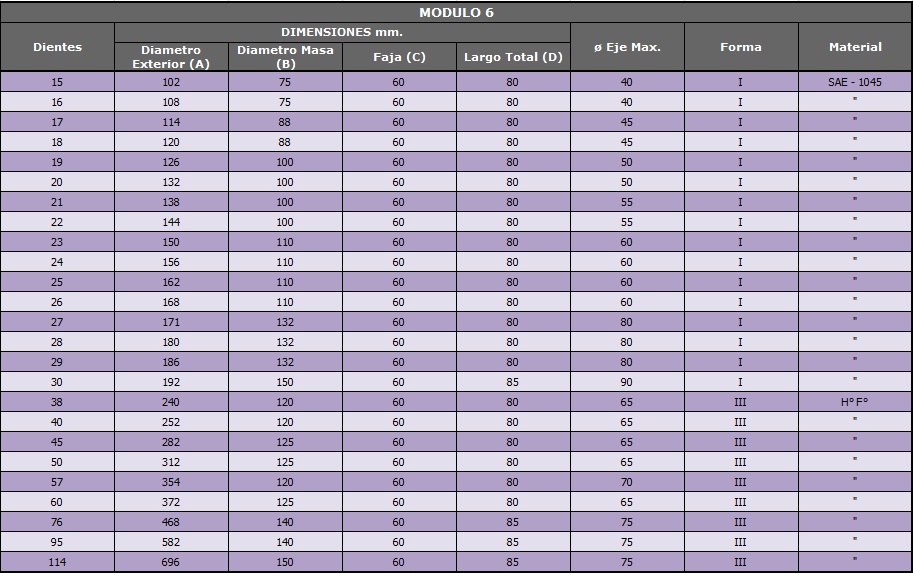El movimiento circular de uno de ellos pondrá en funcionamiento al otro, resultando en este último, una rotación en sentido opuesto a la del primero. Son fabricados en acero SAE-1045 y/o fundición gris.