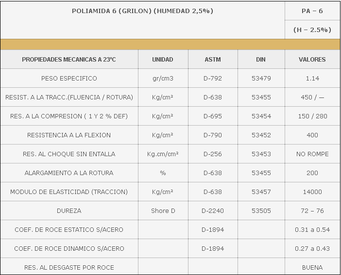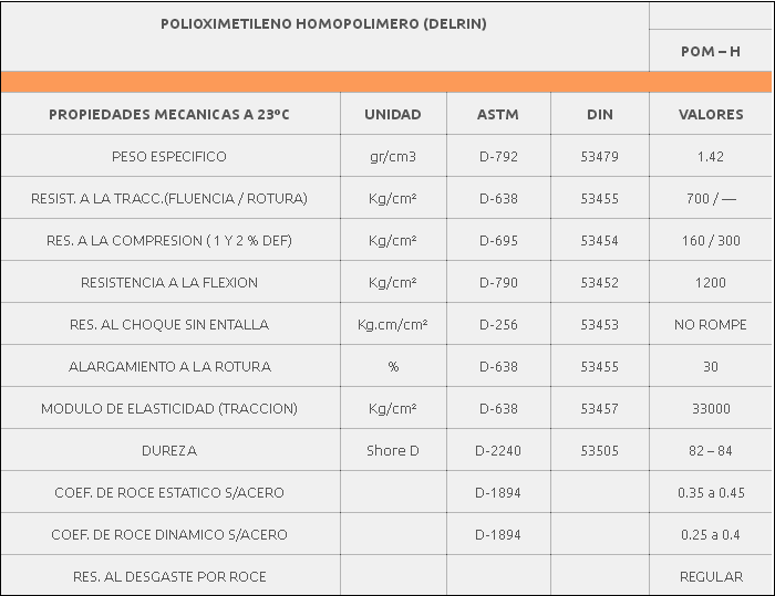 Material duro elástico con alta resistencia mecánica y a la abrasión, con una rigidez, dureza y tenacidad que lo hacen recomendable para distintas piezas técnicas como engranajes, tornillos transportables, piezas deslizantes, anillos de juntas, bujes, manguitos hidráulicos y toda pieza sometida a desgaste e impacto. Buena resistencia a los agentes químicos, salvo a los óxidos concentrados.