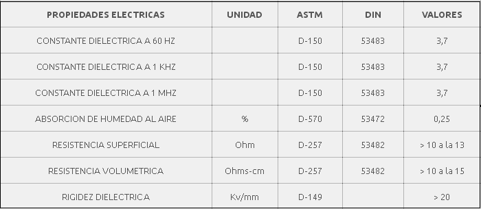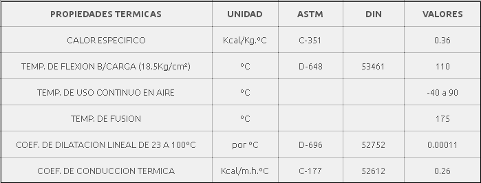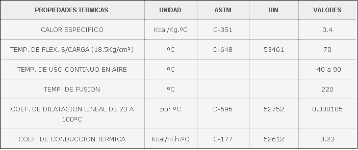 Buena facilidad de mecanizado. La estabilidad térmica de este material, dependiendo del estado de la carga, le permite soportar temperaturas de 10 a 100 ° C en forma continua. Posee gran resistencia a los golpes, excelente resistencia mecánica y buena resistencia a la fatiga y al desgaste.